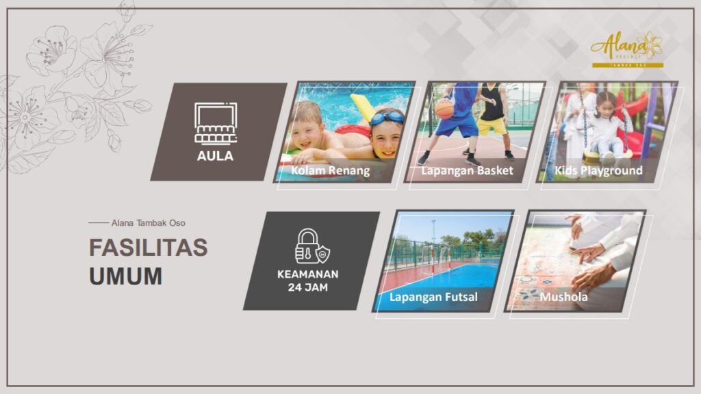 Dengan lokasi yang sangat strategis, hanya 1,3 km menuju Kota Surabaya, Perumahan Alana Regency memiliki beberapa tipe rumah dengan berbagai macam fasilitas umum mulai dari aula, kolam renang, mushola, taman bermain, keamanan 24 jam dan masih banyak lagi.